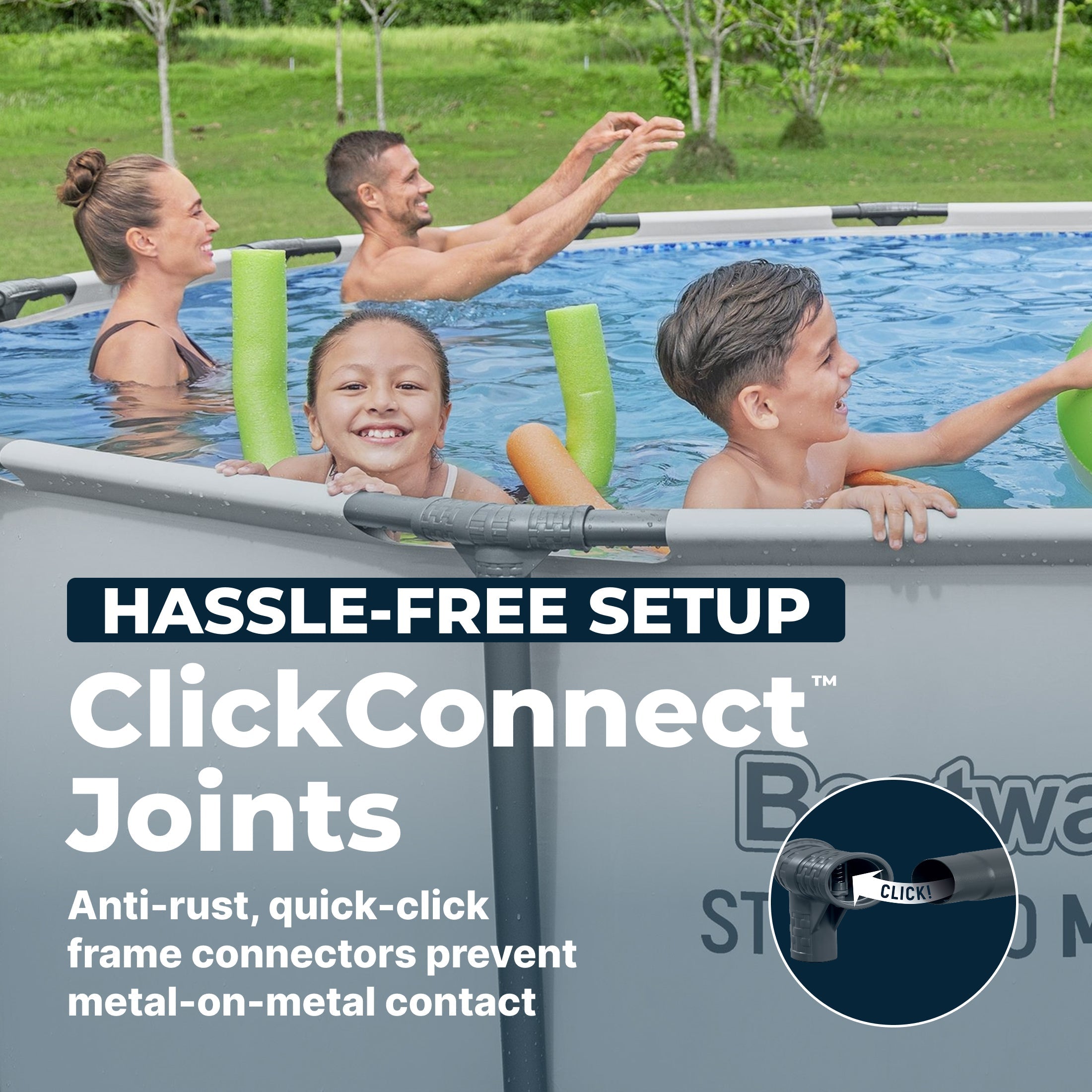 The durable pool frame is constructed with superior corrosion-resistant steel to ensure stability and longevity. The ClickConnect™ joints make setting the pool up a breeze, with no additional tools or accessories needed. The frame connectors also prevent metal-on-metal contact to ensure rust-resistance. The sturdy Tritech® liner is made out of an ultra-durable 3-layer material that is reinforced for strength and puncture-resistance. Tritech is 15% more tear-resistant, 33% more stretch-resistant and 83% more puncture-resistant than standard PVC, ensuring your pool will last summer after summer.