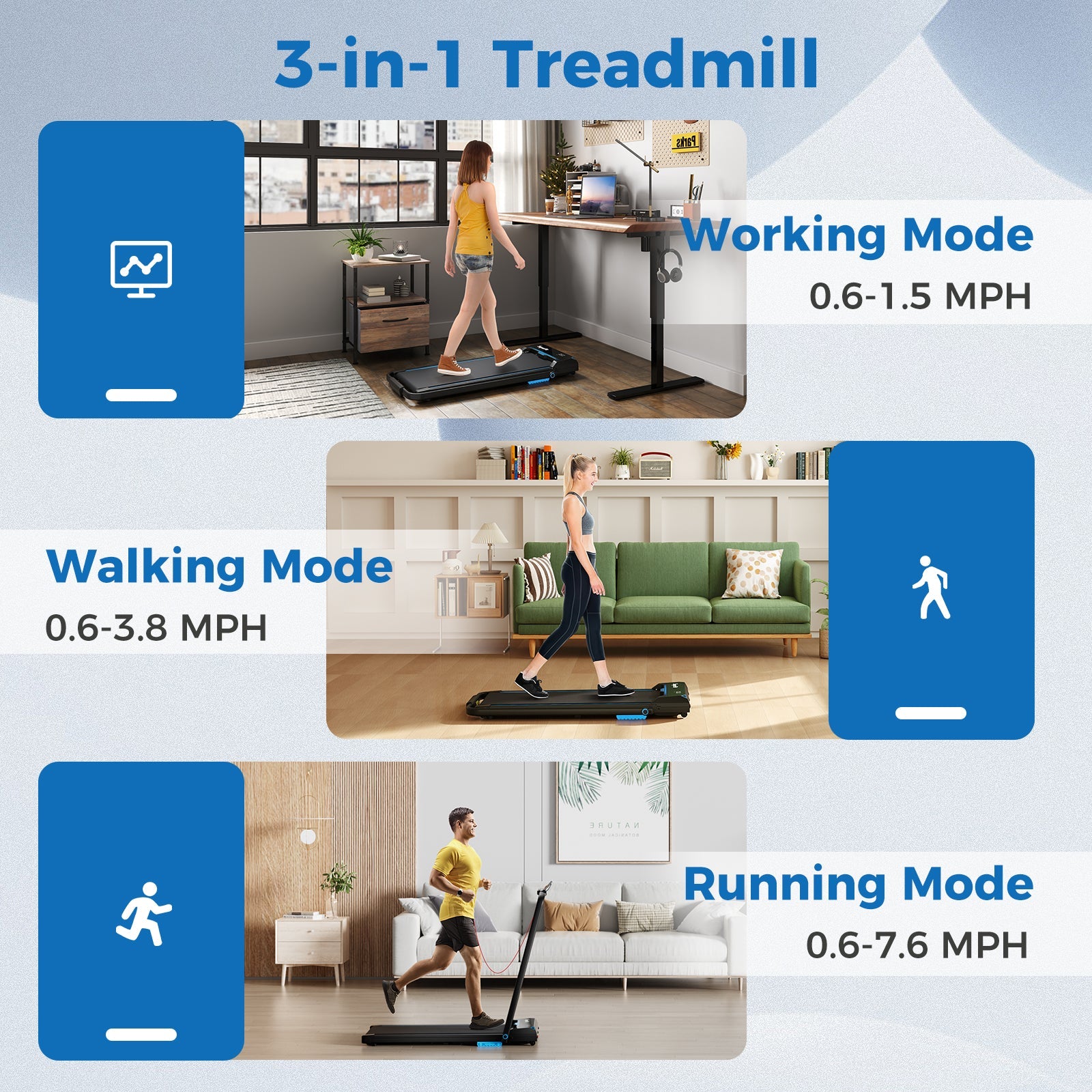 - 3-in-1 Functionality: This treadmill features an innovative 3-in-1 design, which adapts to your pace and purpose. Use it as an under desk walking treadmill at 0.6-3.8 mph, or unfold and accelerate to a robust 0.6-7.6 mph running treadmill. Moreover, you can use 0.6-1.5 mph speed range as a working mode.