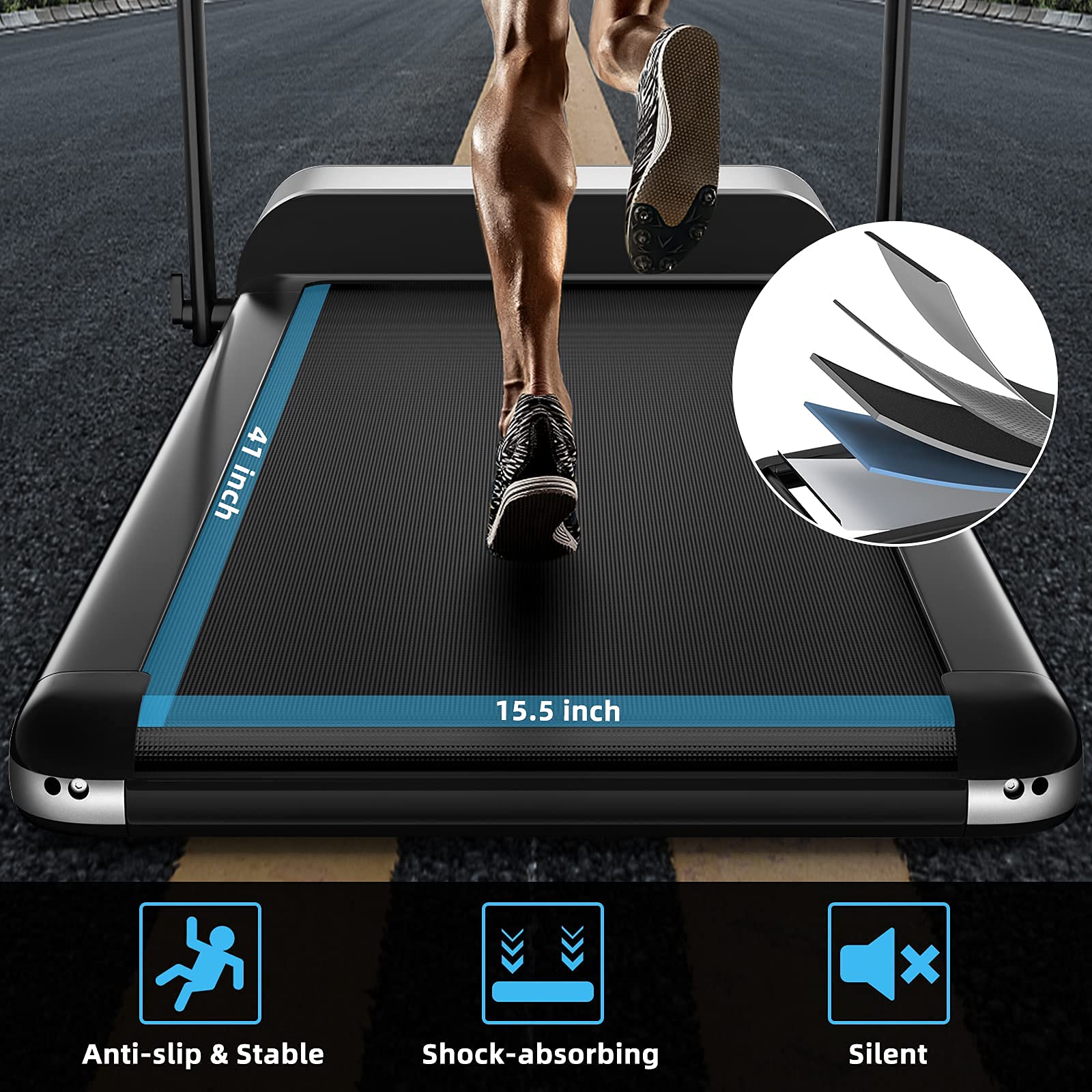 The 15.5” x 41” large-area rubber running belt is shock-absorbing and non-slip, reducing the impact of motion and providing you with the best sports experience.